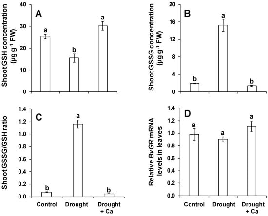 2.5. Foliar Application of Ca2+ Regulated the Glutathione Pool under Drought Stress