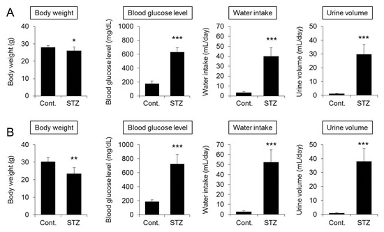 Body weight, blood glucose level, water intake, and urine volume. Mice were given a single intravenous administration of streptozotocin (STZ). After four weeks (A) or eight weeks (B), body weight, the blood glucose level, water intake, and urine volume were measured (mean ± SD, n = 5; * p < 0.05, ** p < 0.01, and *** p < 0.001).