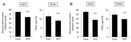 Dermal water content and transepidermal water loss (TEWL). Mice were given a single intravenous administration of STZ. After four weeks (A) or eight weeks (B), the dermal water content (DWC) and TEWL were measured (mean ± SD, n = 5, *** p < 0.001).