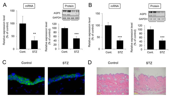 Recently, it was shown that aquaporins (AQPs) play an important role in water and glycerol transport in the body. AQPs are channels that exist in the cell membrane and allow water and glycerol to pass in and out of the cell according to the osmotic pressure gradient. In humans, 13 subfamilies from AQP0 to AQP12 are distributed throughout the body. AQP3 is abundantly expressed in the skin, and it has been reported that Aqp3 knockout mice have decreased dermal water content and skin flexibility and elasticity [6]. Recently, the relationships between AQP3 and skin diseases have been highlighted; it has been reported that AQP3 expression decreases during aging [7], psoriasis [8], and vitiligo [9,10] but that AQP3 expression increases during atopic dermatitis [11], scleroderma [12], and skin cancer [13]. During the onset of diabetic xeroderma, water transport in the skin is considered to be an important factor, but the relationship of diabetic xeroderma with skin AQP3 is not well understood. To date, it was known that AQP3 constitutes an important molecule in the onset of diabetes; transgenic Aqp3-deficient mice develop nephrogenic diabetes insipidus [14]; changes in the expression of AQP3 in the adipose tissue [15], liver [16], or kidneys [17] have been associated with the development of type 2 diabetes. In this study, we focused on AQP3 in the skin to conduct basic research on the mechanism underlying the onset of diabetic xeroderma, with the aim of proposing new preventive and therapeutic approaches. First, a streptozotocin (STZ)-induced diabetic mouse model was established, and the relationship between the dermal water content and expression level of AQP3 in the skin was analyzed to investigate the role of AQP3 in the development of xeroderma. Then, the mechanism by which the expression level of skin AQP3 varies in diabetes was investigated.