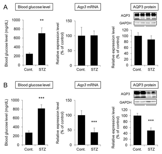 Why did the expression of skin AQP3 decrease in diabetes? We first identified the point after STZ treatment at which AQP3 expression decreased. The results showed that skin AQP3 expression was similar in STZ-treated mice and control mice at one week after STZ treatment, although an increased blood glucose level was observed. In contrast, although an increase in the blood glucose level was observed in mice at two weeks after STZ treatment, unlike at one week, skin AQP3 expression was significantly decreased. These results showed that the expression of AQP3 in the skin decreased during the second week after STZ treatment. In addition, it was found that the increase in the blood glucose level was unlikely to cause a decrease in skin AQP3 directly.