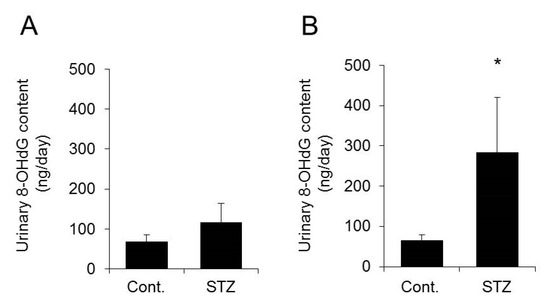 Urinary 8-hydroxydeoxyguanosine (8-OHdG) levels. Mice were given a single intravenous administration of STZ. After one week (A) or two weeks (B), the 8-OHdG concentration in the urine was measured (mean ± SD, n = 5, * p < 0.05).