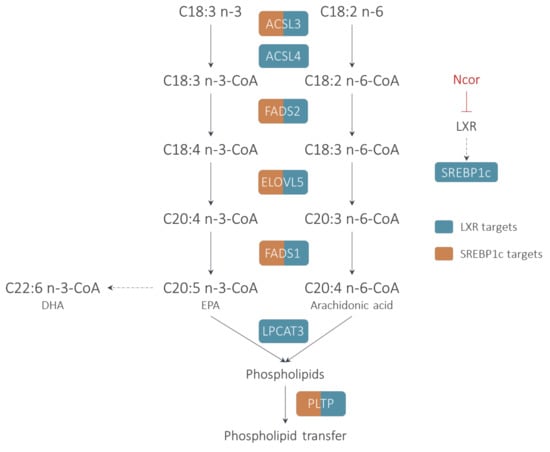 As aforementioned, the activation of the FA substrate into acyl-CoA via a thioesterification reaction is an important limiting step for PUFA synthesis. This reaction is catalyzed by a class of enzyme called acyl-CoA synthases. Although there are at least five long-chain fatty acyl CoA synthases (ACSLs), they display differential tissue distribution and specificity toward FAs. Two members of the family, ACSL3 and ACSL4, are regulated by LXRs. ACSL3 exhibits a preference for C18-C20 PUFAs over saturated and monounsaturated fatty acids []. The regulation of ACSL3 by LXR has been observed in placental trophoblast cells, macrophages, and the liver [,,]. ACSL3 is directly regulated by LXR via a functional LXRE that has been described in the gene promoter. An indirect regulation of ACSL3 by LXR through SREBP1c also occurs [,]. The activation of ACSL3 by LXR induces an overall increase of acyl-CoA synthase activity and uptake of FAs by the cells []. ACSL4, an arachidonate-preferring acyl-CoA synthase, is also induced by synthetic LXR ligands and desmosterol in mouse macrophages while the LXR-regulation in human cells appears less pronounced [,].