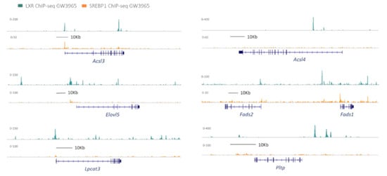 UCSC genome browser tracks depicting LXR and SREBP1 ChIP-Seq peaks (normalized tag counts) at genes involved in PUFA and phospholipid metabolism in mouse macrophages treated with GW3965. Images created from data by Oishi et al. Cell Metab. 2017 Feb 7;25(2):412-427 (GSE79423) [].