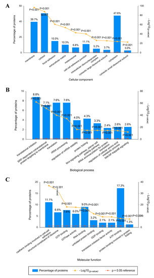 Gene ontology analysis of Mel202-derived ectosomal proteins using the UniProt protein database. Proteins were grouped according to the cellular compartments of their origin (A), involvement in different biological processes (B), and molecular functions (C). In each case, the ten most abundant groups (according to the percentage of assigned proteins) were presented on each graph. The p-value depicts the statistical significance of protein enrichment within the given categories.