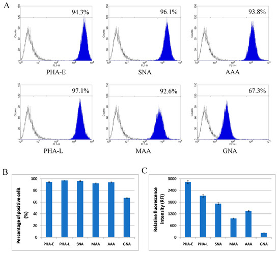 Flow cytometry analysis of surface glycosylation of Mel202 cells. (A) Histograms for MAA-, SNA-, GNA-, AAA-, PHA-E-, and PHA-L-positive cells. Colored areas represent staining with a panel of six lectins, while open histograms represent background fluorescence of the unspecific binding of extravidin-fluorescein isothiocyanate (FITC). The x-axis shows log fluorescence intensity and the y-axis shows the number of events. (B) Diagram showing the percentage of positive cells in each staining. (C) Diagram showing the relative fluorescence intensity (RFI) for each staining.