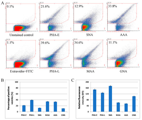 Flow cytometry analysis of surface glycosylation of Mel202-derived ectosomes. (A) Dot plots for MAA-, SNA-, GNA-, AAA-, PHA-E-, and PHA-L-positive ectosomes. Results for unstained control and control secondary extravidin-FITC staining are also provided. The x-axis shows values obtained using medium angle light scatter (MALS) and the y-axis shows log fluorescence intensity measured on 488Gn laser. (B) Diagram showing the percentage of positive ectosomes in each staining calculated via the subtraction of the value for the unspecific binding (secondary FITC-extravidin staining) from the raw value for each lectin staining. (C) Diagram showing the relative fluorescence intensity (RFI) for each staining.