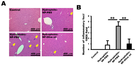 2.7. Hydrophobic-NP-PBS Induced Infiltrations of Inflammatory Cells in the Liver
