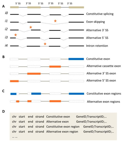 Schematic illustration of alternative splicing events and exon classification. Four representative types of alternative splicing events are demonstrated with a four-exon gene, in which each change is marked by an asterisk (A). The two kinds of exon classification are shown in (B) and (C), which could be accordingly annotated into a Browser Extensible Data (BED)-like file (D). Exons and introns are denoted by the colored boxes and solid lines, respectively. SS—splice site.