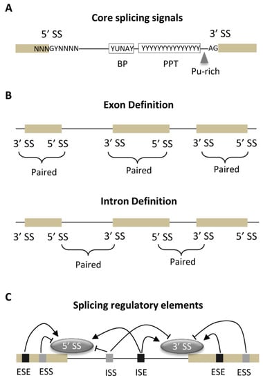 Splicing signals, recognition models and splicing regulatory elements. The core splicing signals within pre-mRNA and their consensus sequences are schematically illustrated (A). N, any purine or pyrimidine; Y, any pyrimidine; Pu-rich, purine-rich element. (B) The recognition models of spliceosome include “Exon Definition” and “Intron Definition”. The locations and roles of splicing regulatory elements are shown in (C), for which the three-letter abbreviations are stated in the main text. BP—branch point; PPT—polypyrimidine tract; ESS—exonic splicing silencers; ISS—intronic splicing silencers; ESE—exonic splicing enhancers; ISE—intronic splicing enhancers.