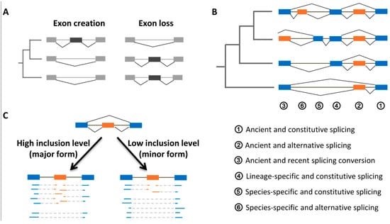 Within one existing gene, one or more exons can be newly created and also lost during the evolutionary process (Figure 3A). Among both of them, exon creation events are much more widespread than exon loss and hence significantly contribute to diversification of protein function []. New exons could derive from the external insertion/tandem duplication of existing exons and also from de novo exonization of intronic sequences []. The exonizations mainly originate from these transposable elements, such as the long interspersed nuclear elements (LINEs) and short interspersed nuclear elements (SINEs), because they always carry the consensus motifs resembling real splice sites []. When putting exons’ splicing patterns in an evolutionary context, they become much more complex, as shown in Figure 3B. First, exons could be assigned different evolutionary ages according to what extent they were evolutionary conserved, such as the species-specific (or recently created), lineage-specific (or early evolved), and ancient (or fully conserved) exons. Similarly, the splicing pattern of orthologous exons would change or not change when compared among different organisms. Therefore, every exon should be described by its conservation levels for both evolutionary origin and splicing pattern, for which six exons were representatively exemplified (Figure 3B).