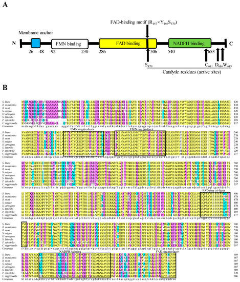 Sequence analysis of the SlCPR protein (A). The protein contains predicted flavin mononucleotide (FMN)-, flavin adenine dinucleotide (FAD)-, and NADP-binding domains. The proteins also conserved residues such as the FAD-binding motif (R467, Y469, and S470) and the predicted catalytic residues (S470, C641, D686, and W688). (B) Comparison of the deduced amino acid sequence of SlCPR with other NADPH-cytochrome P450 reductases (CPRs). Accession numbers of indicated CPR amino acid sequences are shown in Table 1.