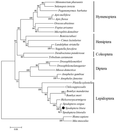 Based on the deduced amino acid sequence of SlCPR and 28 other CPRs, phylogenetic analysis was performed using MEGA 7.0 software and the neighbor joining method. The constructed tree showed that CPRs from insects of the same order were grouped together. As expected, SlCPR was most related to CPRs of other Lepidoptera insects, including P. xylostella, Chilo suppressalis, Bombyx mandarina, Bombyx mori, H. armigera, S. exigua, and S. littoralis (Figure 2, Table 1).