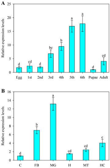 Relative expression levels of SlCPR at different development stages (A) and in various tissues (B). Whole body of S. litura larvae were used for the different development stages, while fifth-instar larvae were used for various tissues. Expression levels of SlCPR were determined by quantitative reverse transcriptase PCR (RT-qPCR), and β-actin and EF1 were selected as reference genes. Each RT-qPCR reaction for each sample was performed in three biological replicates and three technical replicates. Data shown are means ± SE. Different letters (a,b,c,d) above bars indicate significant differences (p < 0.05) according to Duncan’s multiple range test. Abbreviations: 1st to 6th—first- to sixth-instar larvae; C—cuticle; FB—fat body; MG—midgut; H—head; MT—Malpighian tubule; HC—hemocytes.