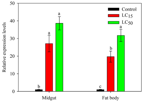 Effects of phoxim on SlCPR expression in the midgut and fat body of fifth-instar larvae. Larvae were exposed to phoxim at LC15 (4 μg/mL) and LC50 (20 μg/mL) doses for 24 h. SlCPR expression levels were normalized to β-actin and EF1 expression and presented as the means ± SE with three independent biological replicates and three technical replicates. Different letters (a,b,c) above bars indicate significant differences (p < 0.05) according to Duncan’s multiple range test.