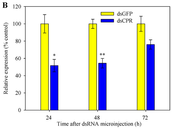 DNA for in vitro transcription reactions was amplified by PCRs using cDNAs of SlCPR and GFP (green fluorescent protein; accession number ACY56286) as a control. The PCRs were performed with the following primers: (i) CPR-RNAi-F (5′-ATGGTTGCTGATCCCGAAGAA-3′) and T7CPR-RNAi-F (5′-aatacgactcactatagggATGGTTGCTGATCCCGAAGAA-3′), (ii) CPR-RNAi-R (5′-AGGCCAAACACGGCATAATTT-3′) and T7CPR-RNAi-R (5′-aatacgactcactataggg AGGCCAAACACGGCATAATTT-3′), (iii) T7GFPdsRNAF (5′-AATACGACTCACTATAGGGAAGGGCGAGGAGCTGTTCACCG-3′) and GFPdsRNAR (5′CAGCAGGACCATGTGATCGCGC-3′), and (iv) GFPdsRNAF (5′-AAGGGCGAGGAGCTGTTCACCG-3′) and T7GFPdsRNAR (5′-AATACGACTCACTATAGGGCAGCAGGACCATGTGATCGCGC-3′) [25]. The SlCPR PCR product corresponded to the nucleotide position 361 to 551 of the SlCPR coding region. The PCR products were then purified with a PCR purification kit (Qiagen, Venlo, The Netherlands) and used as templates to synthesize double-stranded RNA (dsRNA) with the T7 RiboMAX™ Express RNAi System (Promega, Madison, WI, USA). The dsRNA was adjusted with DEPC-treated (RNase-free) water to a final concentration of 1.5 μg·μL−1 and kept at –80 °C for further use. Subsequently, 2 μL (3.0 μg) of dsRNA were injected into the side of the thorax of fifth-instar (day 2) larvae of S. litura using a manual microinjector (model No. MS05, Chengdu Centome Company Ltd., Chengdu, China). Thirty fifth-instar larvae microinjected with dsCPR or dsGFP were incubated in the insectary for 24, 48, and 72 h, respectively. RNA was then isolated from the midgut and fat bodies, respectively. Tissue from three larvae were used for each RNA extraction. SlCPR expression levels in the midgut and fat bodies were determined by RT-qPCR. Three independent replicates were conducted for all treatments.