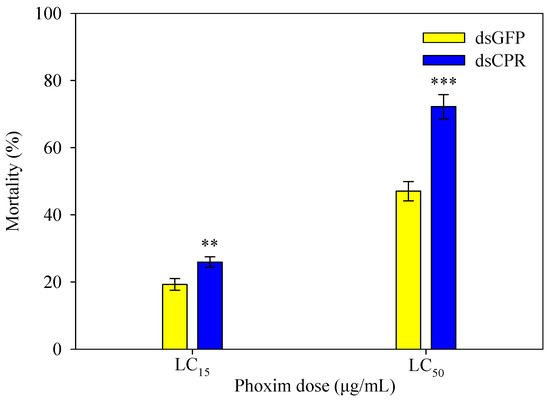 Mortality rates of fifth-instar larvae that were first microinjected with dsCPR (or dsGFP) and then exposed to phoxim are shown in Figure 6. When larvae were injected with dsGFP, mortality was 19.3% at the LC15 dose and 47.0% at the LC50 dose, respectively. However, compared to these control larvae, phoxim-induced mortality of SlCPR-silenced larvae was considerably increased (by 34.6% at the LC15 dose; by 53.5% at the LC50 dose) (Figure 6). These results indicate that SlCPR-silenced larvae exhibit an increased susceptibility to phoxim.