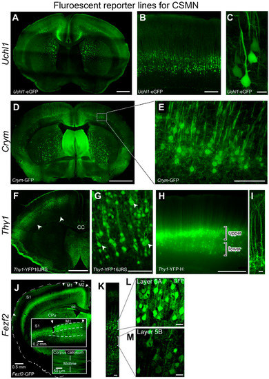 Recently, numerous novel techniques and approaches have been developed to help identify and visualize CSMN within the complex structure of the cerebral cortex. Retrograde labeling surgery, AAV-mediated gene delivery, and novel reporter lines now have the potential to change the future of CSMN investigations [2,120,216,217]. Reporter lines have been very informative on marking the cells and neurons of interest with fluorescence. To date, numerous reporter lines are generated which genetically labels upper motor neurons with fluorescence (Figure 1). Even though the labeling may not be cell-type specific in all of the reporter lines, presence of fluorescence allows detailed cellular analyses. Mu-crystallin (Crym)-GFP reporter is a high-fidelity marker of the CST [218]. CST labeling with Crym-GFP is ten times more efficient compared with BDA; however, low-level expression requires significant amplification of the GFP signal using immunofluorescence techniques. Thy1-YFP mice have extensively been used to study motor systems, not only SMN in mouse models of ALS [219,220], but also CSMN [221,222,223] and their axons in spinal cord injury [224] and an ALS mouse model [225]. Fezf2-GFP labels a heterogenous population of neurons that include corticospinal projection neurons and corticothalamic projection neurons in layer 5A and crossed corticostriatal projection neurons and crossed-corticocortical projection neurons in layer 5B of the mature motor cortex [226].
