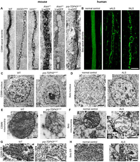 Betz cell pathology is similar between mouse and human at a cellular level. (A) Apical dendrites of CSMN displaying vacuoles in brains of various mouse models of motor neuron disease. (B) Apical dendrites of Betz cells displaying vacuoles in brains of patients with sporadic or familial ALS. (C–H) Electron microscope images showing pathology of various organelles in CSMN of prp-TDP43A315T mouse and Betz cells of ALS patients. Observe similar nuclear membrane defects (C,D), mitochondria defects (E,F), and endoplasmic reticulum defects (G,H). Scale bars: 5 μm (brightfield, left), and 1 μm (E.M., right) in (A), 10 μm in (B), 2 μm in (C), 500 nm in (D), 200 nm in (E), 500 nm in (F), 1 μm in (G–H).