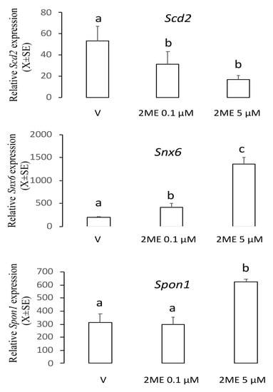 Levels of the transcripts Scd2, Snx6, or Spon1 in the Ishikawa cells treated with a non-apoptotic (0.1 µM) or apoptotic (5 µM) concentration of 2-methoxyestradiol (2ME). Cells were incubated with 2ME for 12 h and then processed by real-time PCR. This experiment consisted of 5 replicates. a ≠ b ≠ c, p < 0.05. Note that Spon1 was increased only at the apoptotic concentration of 2ME.