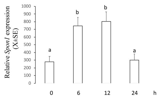 Levels of Spon1 in the Ishikawa cells treated with 2ME 5 uM during 0, 6, 12, or 24 h and then processed by real-time PCR. This experiment consisted of 5 replicates. a ≠ b, p < 0.05. Note that Spon1 was increased at 6 and 12 h after treatment.