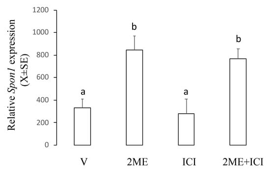 Levels of Spon1 in the Ishikawa cells treated with 2ME alone or concomitant with the estrogen receptor antagonist ICI182780 (ICI). V is the control group. This experiment consisted of 5 replicates. a ≠ b, p < 0.05. Note that ICI did not affect the 2ME-induced Spon1 increase.