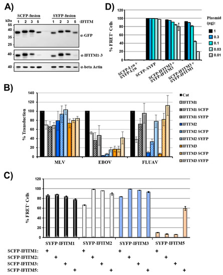 We next asked whether coexpression of IFITM paralogues fused to SCFP and SYFP, respectively, induces FRET signals. Apart from IFITM1-3, which were all shown to display antiviral activity, we also tested IFITM5 [2,3]. As a prerequisite to these studies, all IFITM proteins were N-terminally fused to SCFP and SYFP and analyzed for expression and antiviral activity. Western blot analysis of transfected 293T cells revealed that all fusion proteins were robustly expressed, although expression of IFITM5-based fusion proteins was slightly reduced compared to that of the other IFITM proteins studied (Figure 2A). Similar results were obtained in cells engineered to stably express IFITM1-3 and the respective SCFP/SYFP fusion proteins (not shown), which were used for analysis of antiviral activity. Fusion of IFITM1-3 to fluorescent proteins was compatible with inhibition of Ebola virus glycoprotein (EBOV-GP)-driven entry, although the efficiency of inhibition by IFITM2-3-SCFP/SYFP fusion proteins was reduced compared to wild type (wt) proteins (Figure 2B). In contrast, fusion of IFITMs to fluorescent proteins largely abrogated blockade of influenza A virus hemagglutinin (FLUAV-HA)-mediated entry (Figure 2B). These results indicate different roles of the IFITM N-terminus in blockade of EBOV and FLUAV infection, although we cannot exclude that potential differences between expression of IFITM-wt and IFITM-SCFP/SYFP fusion proteins contributed to differential anti-FLUAV activity. Coexpression of IFITM1-3 and IFITM5 fused to SYFP with the identical IFITM proteins fused to SCFP resulted in robust FRET signals, and similar results were obtained for combinations of different IFITM proteins (Figure 2C, Supplementary Figure S3), indicating that these proteins have a high tendency to form homo- and heterooligomers. The only exception was observed for the reverse combination of IFITM5 fused to SCFP with IFITM1-3 fused to SYFP, which yielded low FRET signals (Figure 2C, Supplementary Figure S3). While the reasons for this phenomenon are unclear at present, it could indicate a different donor/acceptor configuration, in which reduced availability of the acceptor (in this case SYFP-IFITM5) results in reduced FRET-efficiency [43]. Apart from that, all FRET signals were more robust than those observed for SCFP/SYFP artificially targeted to membranes (Figure 1D, Supplementary Figure S2 and data not shown), suggesting signal augmentation due to real protein–protein interactions at cellular membranes.