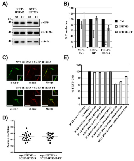 Here, we used a flow cytometry-based fluorescence resonance energy transfer (FACS-FRET) assay [30] to analyze interactions of IFITM proteins and correlated them with antiviral activity. We provide evidence for extensive homo- and heteromultimerzation of IFITM proteins and confirm that residues F75 and F78 are important for antiviral activity. However, mutation of these residues was compatible with normal IFITM3 localization and IFITM3/IFITM3 interactions, indicating that F75 and F78 impact antiviral activity by a so far unknown mechanism.
