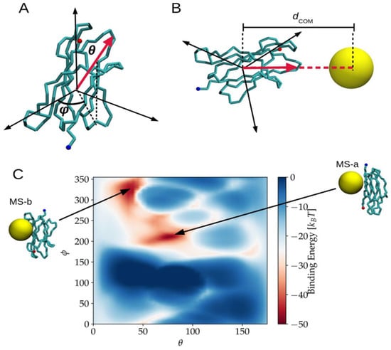 Schematic representation of the energy binding sampling and the binding energies results for the MS model. (A) A point on the surface of the protein can be represented by the pair of angles (Φ,θ). (B) The total potential energy is calculated for each pair if (Φ,θ) and a function of the distance from the center of the NP to the COM of the protein, dCOM, is known. The binding energy for each orientation is defined as the minimum of the total potential energy. (C) Binding energy map for β2μ interacting with Au25(S(CH2)2Ph)18−, Red areas show regions in the protein that bind more strongly to the NP.