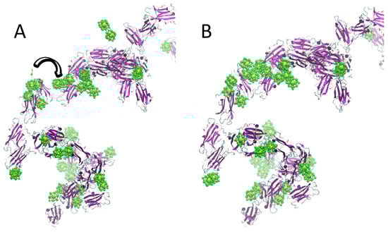 Dynamic simulations using the MS model were performed using HOOMD [,]. The box size and number of NPs and proteins were the same as in the CG simulations. A Langevin thermostat with a friction coefficient of 0.001 ps−1 was used, and the time step was set to 0.15 ps. NPs were assigned a mass of 7.4 kDa, while all amino-acids were assigned a mass of 0.12 kDa. This value comes from dividing the total mass of the protein (12 kDa) by the number of residues of the protein (99). The proteins were kept rigid during the simulation using the rigid body tool implemented in HOOMD [].