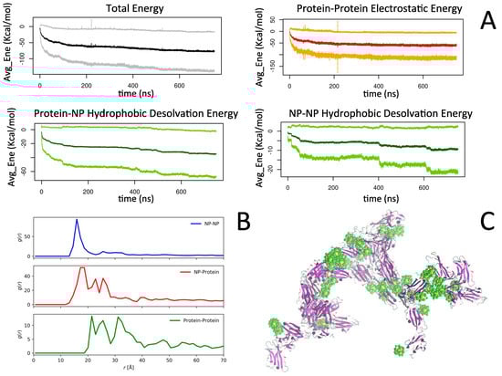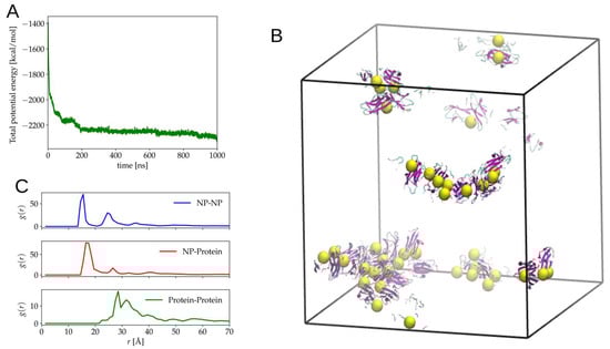 (A) Time evolution of total potential energy dynamic simulations using the MS model. (B) Snapshot of the final configuration. (C) The radial distribution function of the pairs NP-NP, NP-Protein, and Protein-Protein. Protein all-atom reconstruction was performed with PULCHRA [].
