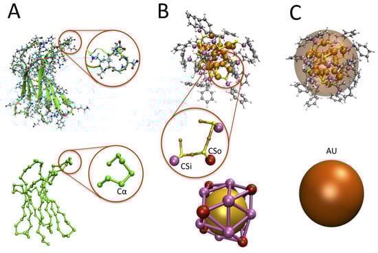 For the protein component, the natural structural organization has suggested several kinds of residue-level coarse-grained (CG) models [,]. The maximum computational advantage is obtained with Cα single bead per amino-acid models with implicit solvent, also called “minimalist” [,], previously used and tested with a large number of different proteins [,] even in interaction with coarse representations of the cytoplasm component []. The available CG models for NPs, conversely, are rather sparse and diverse. The presence of the gold core suggests treating it at the mesoscale (MS) as a single spheroidal object [], while the specificity of the chemical decoration [,] have fundamental roles for the interaction with proteins and must be treated at a higher resolution [,,,], to account for the hydrophobicity and/or electric charge borne by functionalizing groups.