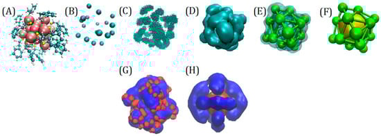 For the NP-CG model, one needed to, first of all, fix the relative position of the AU bead and the 18 beads corresponding to the functional groups. As mentioned before, their representative atoms were chosen to be the C bound to S (CS). The procedure to find their optimal location is described in Figure 7. Using a 500 ns atomistic simulation of a single fully hydrated nanoparticle, we first aligned the NP atomistic structure to the gold core atoms (Figure 7A) and then “coarse-grained” the trajectory leaving only AU and CS (Figure 7B). Subsequently, we built a volume map from the space superposition of CSs and found the centroids of the 18 space clusters [] (Figure 7C–E), which are as CS beads locations. Further details are reported in the Supplementary Materials (Section S3).