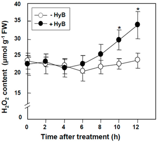 To examine the effect of HyB on the accumulation of H2O2, leaf segments of rice seedlings were treated with or without 50 mg mL−1 HyB for various times. H2O2 level increased with increasing treatment time. H2O2 level slightly increased after 6-h treatment and significantly increased after 10-h treatment (Figure 1).