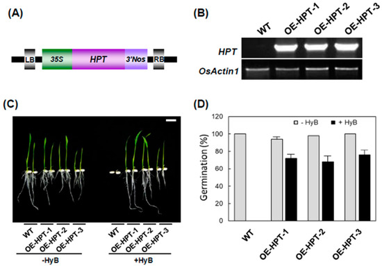 Generation of transgenic rice overexpressing hygromycin phosphotransferase. (A) Schematic representation of the pPZP/HPH binary vector used for rice transformation. 35S, Cauliflower mosaic virus 35S promoter; HPT, hygromycin phosphotransferase (HPT); 3’Nos, 3’UTR of Nopaline synthase. (B) RT-PCR analysis of mRNA expression of HPT in wild-type (WT) and HPT-overexpressing rice plants. OsActin1, rice actin1 gene. (C) Phenotypes of rice seedlings grown on hydroponic solution with (+HyB) or without (−HyB) 50 mg L−1 HyB for 7 days. (bar = 1 cm). (D) The number of germinated and non-germinated plants in WT and HPT-overexpressing rice plants grown on hydroponic solution with (+HyB) or without (−HyB) 50 mg L−1 HyB for 7 days (n = 50). Absolute percent germination is reported as the average of the mean of three independent experiments with the error bars representing SD.