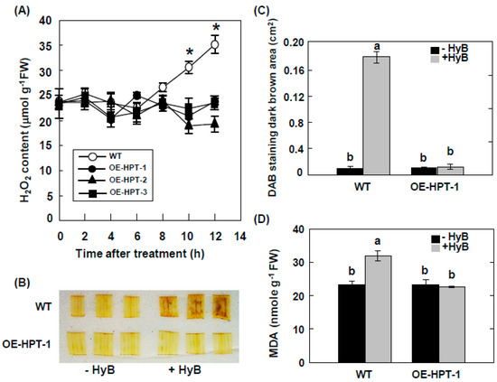 H2O2 content in WT and HPT-overexpressing seedlings under HyB treatment. (A) changes in H2O2 content in leaf segments of WT and HPT-overexpressing 2-week-old seedlings treated with 50 mg L−1 HyB for 12 h. Data are mean ± SE (n = 4). * P < 0.05 compared with WT. (B) Histochemical detection of H2O2 with DAB staining in leaf segments of WT and HPT-Overexpressing rice plants (OE-HPT-1) treated with or without HyB. (C) Quantification of DAB staining. The histogram tool in ImageJ was used to record the grayscale values of all pixels within the brown areas of eight-bit images. (D) Malondialdehyde (MDA) content in WT and HPT-overexpressing rice plants (OE-HPT-1) treated with or without 50 mg L−1 HyB for 12 h. Data are mean ± SE (n = 4). Bars with a same letter are not significantly different at P < 0.05.