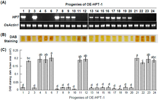 To test the accuracy of the DAB–H2O2 method for distinguishing transgenic plants, we used RT-PCR and the DAB method to examine 24 T1 segregants from one transgenic plant carrying the HPT transgene (OE-HPT-1). On RT-PCR, HPT was detected in transgenic progenies but not null segregants (Figure 4A). T1 segregants without HPT transcripts showed significant DAB–H2O2 accumulation. Conversely, plants expressing HPT showed no significant DAB–H2O2 accumulation (Figure 4B). Thus, the DAB–H2O2 method was as reliable as RT-PCR for detecting transgenic plants containing an HyB-resistant gene.