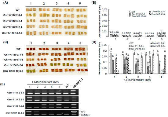 Further RT-PCR analysis was conducted to validate the presence of the HPT gene in genome-edited lines. HPT could be detected in several segregants of osrr6/11#5-1-1, osrr9/10#9-2-4, and osrr9/10#10-3-6 (No. 1–5). In contrast, no HPT product could be detected in five segregants of osrr6/11#2-3-1, which indicates lack of the transgene in osrr6/11#2-3-1 (Figure 5C). However, segregants of genome-edited plants containing the HPT gene in osrr6/11#5-1-1 (No. 1 and 5), osrr9/10#9-2-4 (No. 3–5), and osrr9/10#10-3-6 (No. 1 and 2) all showed slight DAB–H2O2 staining (Figure 5B). In contrast, strong DAB–H2O2 accumulation was detected in segregants of genome-edited plants without the HPT gene: Osrr6/11#2-3-1 (No. 1–5), osrr6/11#5-1-1 (No. 2–4), osrr9/10#9-2-4 (No. 1 and 2), and osrr9/10#10-3-6 (No. 3–5). Hence, DAB–H2O2 staining is a reliable method for detecting transgenic plants free of a transgene (Figure 5B,C). No HPT product could be detected in WT plants. Transgenic OE-HPT-1 containing an HPT gene were a positive control.