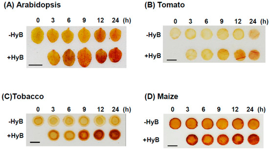 To examine whether H2O2 can be significantly induced by HyB in other plants, we examined plants such as Arabidopsis, tobacco, tomato, and maize. DAB–H2O2 staining showed that H2O2 was highly induced in all tested plants after HyB treatment (Figure 6). Tobacco showed the strongest accumulation of H2O2, followed by Arabidopsis and tomato. The monocot plant maize showed a slight enhancement of H2O2 after HyB treatment.