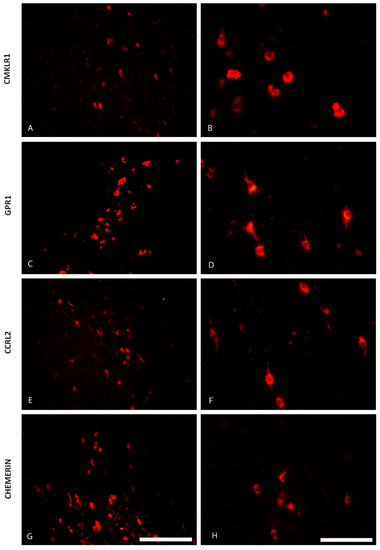 - Guo, X.; Fu, Y.; Xu, Y.; Weng, S.; Liu, D.; Cui, D.; Yu, S.; Liu, X.; Jiang, K.; Dong, Y. Chronic mild restraint stress rats decreased CMKLR1 expression in distinct brain region. Neurosci. Lett. 2012, 524, 25–29. [Google Scholar] [CrossRef] [PubMed]