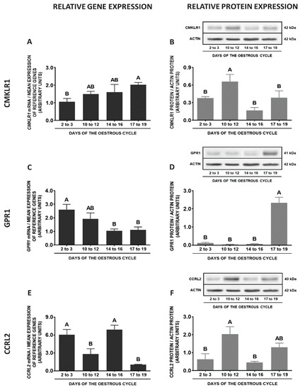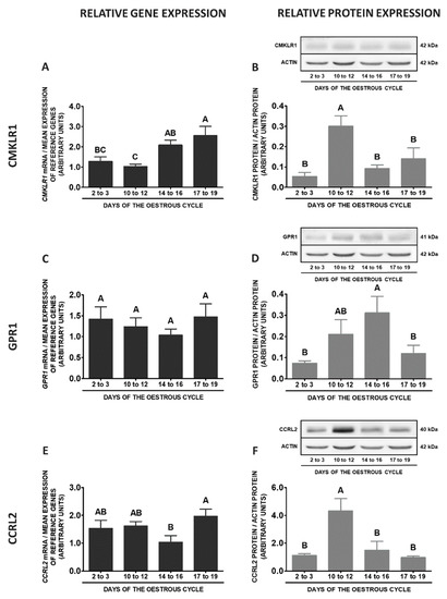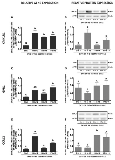 During the oestrous cycle, the concentrations of CMKLR1 mRNA were significantly higher on days 17 to 19 when compared to days 2 to 3, whereas protein contents of this receptor were higher on days 10 to 12 of the cycle than in other studied periods of the cycle (Figure 5A,B; p < 0.05). GPR1 gene expression during the cycle was the highest on days 2 to 3 in relation to days 14 to 16 and 17 to 19. The protein contents of GPR1 were the highest on days 17 to 19 when compared to other studied periods of the cycle (p < 0.05; Figure 5C,D). Higher CCRL2 mRNA expression was noted on days 2 to 3 and 14 to 16, whereas protein contents of this receptor were greater on days 10 to 12 in comparison to days 2 to 3 and 14 to 16 (p < 0.05; Figure 5E,F). The highest expression of RARRES2 was observed on days 2 to 3 and 10 to 12 when compared to days 17 to 19 of the cycle (p < 0.05; Figure 5G).