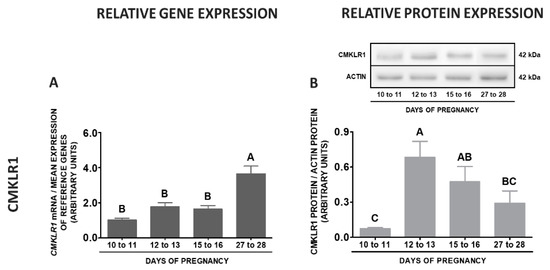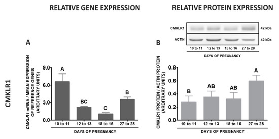 During pregnancy, an elevated levels of CMKLR1 mRNA were observed on days 27 to 28 comparing to other stages of early pregnancy. Protein concentrations of this receptor were the highest on days 12 to 13 in relation to days 10 to 11 and 27 to 28, and the lowest on days 10 to 11 compared to days 12 to 13 and 15 to 16 of pregnancy (p < 0.05; Figure 12A,B). The expression of the GPR1 gene was the highest on days 27 to 28 of pregnancy, lower on days 15 to 16, whereas the lowest on days 10 to 11 and 12 to 13 of gestation. The concentrations of GPR1 protein were elevated on days 12 to 13 and 27 to 28 of pregnancy in relation to the remaining stages of pregnancy (p < 0.05; Figure 12C,D). The highest CCRL2 gene expression was noted on days 27 to 28, whereas the lowest on days 10 to 11 when compared to days 15 to 16 and 27 to 28 of pregnancy. The protein contents of this receptor were the highest on days 27 to 28 in relation to days 10 to 11 and 15 to 16, whereas the lowest on days 10 to 11 compared to days 12 to 13 and 27 to 28 of pregnancy (p < 0.05; Figure 12E,F). The highest expression of the RARRES2 gene was observed on days 27 to 28 of gestation, whereas the lowest on days 12 to 13 in relation to days 15 to 16 and 27 to 28 of pregnancy (p < 0.05; Figure 12G).