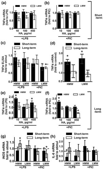 To assess whether the effects of LMW and HMW HA on TNFα are specific for this cytokine, we compared their effect on the expression of other inflammatory markers. iNOS (inducible nitric oxide synthase), IL-6 (interleukin 6). Cells were treated with 450 µg/mL HMW or LMW in the same experimental procedures as for the TNFα testing (Figure 1g,h). Modulation of the iNOS expression was the same as for TNFα (Figure 1g). Long-term incubations with HMW potentiate LPS-induced gene expression, while long-term incubations with LMW decrease PIC-induced gene expression. Short-term incubation with HMW decreased LPS-induced IL-6 expression (Figure 1h).