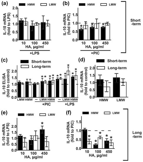 IL-10 is an anti-inflammatory cytokine that is induced in astrocytes after stimulation with LPS or PIC [21,22]. We estimated the influence of various concentrations of HMW and LMW HA on LPS- and PIC-induced IL-10 expression (Figure 2). Short-term (Figure 2a,b) or long-term (Figure 2e,f) incubation with LMW HA did not influence LPS-induced IL-10 mRNA expression. Short-term (Figure 2b) exposition to LMW HA also had no effect, while long-term LMW exposition (Figure 2f) downregulated PIC-induced IL-10 mRNA expression for all tested concentrations. Short-term (Figure 2b) and long-term (Figure 2f) HMW exposition downregulated PIC-induced IL-10 expression, while only long-term exposition to HMW HA at a concentration of 450 µg/mL modulated mRNA IL-10 expression (Figure 2c,f). Note that, while both tested forms of HA induced TLR-mediated IL-10 release at the protein level (Figure 2c), the effects were weak but statistically significant. The addition of HAs without TLR agonists had no effect on the IL-10 release (Figure 2d). So, both tested forms of HA upregulated IL-10 protein expression in a TLR3- or TLR4-mediated manner.