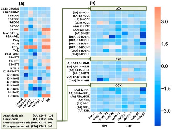 Heatmap representation of oxylipin production of n-6 and n-3 fatty acid-derived lipid mediators. (a) Astrocytes were treated with the high molecular weight hyaluronic acid (HMW, 450 µg/mL) and low molecular weight hyaluronic acid (LMW, 450 µg/mL) for 0.5 or 48 h, and LPS (100 ng/mL) or PIC (10µg/mL) for 4 h. Concentrations of oxylipins in supernatants were measured using UPLC-MS/MS. The heat map shows relative amounts of each lipid mediator compared to the control. The horizontal axis indicates the stimuli, while the vertical axis indicates the relative amount (ln) of each lipid mediator. (b) Astrocytes were pretreated for 0.5 or 48 h with HMW (HMW, 450 µg/mL) and (LMW, 450 µg/mL) HA and then stimulated with LPS (100 ng/mL) or PIC (10 µg/mL) for 4 h. The heat map shows relative amounts (ln) of each lipid mediator compared to the LPS and PIC-stimulated cells respectively. Values represent the mean from three independent experiments. Metabolites were divided into: Lipoxygenase (LOX), cyclooxygenase (COX) and cytochrome (CYP) pathways involved in their synthesis.