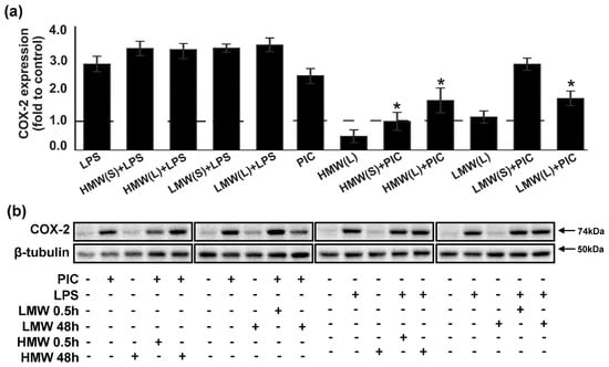 Effects of low molecular weight (LMW) and high molecular weight (HMW) hyaluronic acid (HA) on the expression of COX-2 upon stimulation with TLR3 and TLR4 agonists. (a,b) Astrocytes were pretreated for 0.5 or 48 h with HMW (10, 100 or 450 µg/mL) and (10, 100 or 450 µg/mL) alone or in combination with LPS (100 ng/mL) or PIC (10 µg/mL) for 4 h. COX-2 protein levels were evaluated by western blotting and normalized to the loading control β-tubulin. (b) The example is representative for three independent experiments. Values represent the mean ± SEM from three independent experiments performed in triplicate. * p < 0.05, compared with the stimulated cells (PIC or LPS).