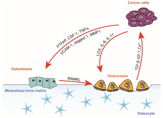In healthy bone tissue, bone formation and bone resorption are in homeostasis. In osteolytic metastases, resorption and formation become uncoupled due to factors secreted by cancer cells. These factors are able to induce osteoclast formation both directly and indirectly through osteoblasts (Figure 1). Parathyroid hormone related peptide (PTHrP), which leads to increased local bone resorption, and TGF-β1, which is a ubiquitous growth factor in the bone microenvironment, were the first molecular players identified in cancer-induced osteolysis. Breast cancer cells produce and secrete PTHrP, which increases bone resorption indirectly by binding to the PTH receptor in osteoblasts [38]. Osteoblasts in turn secrete less osteoprotegerin (OPG), which reduces bone resorption, as well as more RANKL, which binds to the RANK on osteoclasts and induces differentiation and subsequently bone resorption. This results in an imbalance with excessive resorption-inducing signal molecules compared to formation-inducing molecules. Additional factors secreted by cancer cells, such as hypoxia-induced lysyl oxidase (LOX), colony stimulating factor 1 (CSF-1), tumor necrosis factor α (TNFα), vascular cell adhesion molecule 1 (VCAM-1), matrix metalloproteinase 1 (MMP1), Jagged 1, and interleukins 8 and 11, also induce the activation of osteoclasts, some of them directly, independently of RANK, enhancing the imbalance [27,32,39,40,41].