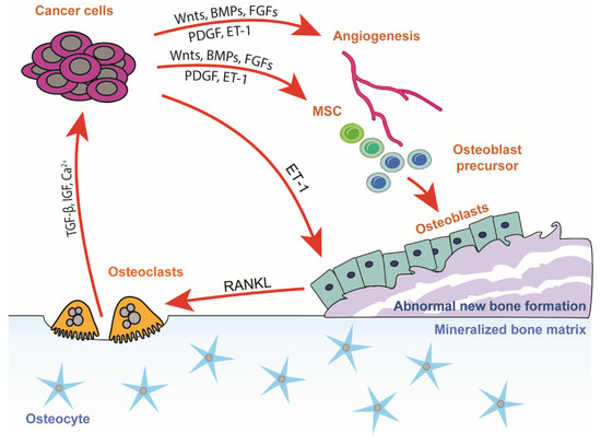 Prostate cancer cells stimulate mesenchymal stem cells (MSCs) toward osteoblastic differentiation by secreting endothelin 1 (ET-1), wingless and Int1 proteins (Wnts), BMPs, TGFs, fibroblast growth factors (FGFs), and platelet-derived growth factors (PDGFs), leading to an increased number of osteoblasts. These factors also induce angiogenesis, expanding the HSC niche that prostate cancer cells can inhabit [27]. Interestingly, ET-1 has been found to be secreted also from breast cancer cells that produce osteoblastic lesions, underlining its overall significance in the osteoblastic lesion type [52].