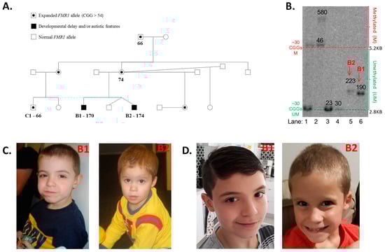 B1 was born at term after an uncomplicated pregnancy and delivery. His parents became concerned with his development from an early age. He had extreme shyness, disliked new social circumstances, avoided some physical contact, and had limited eye contact. He was difficult to settle and he was often irritable and upset. His early motor milestones were normal, but language was significantly delayed. A clinical evaluation with the Griffiths Mental Developmental Scales, Extended Revised led to a diagnosis of mild global developmental delay, with significant difficulties with language and play skills. Fragile X testing by Southern blot analysis of DNA extracted from blood and microarray analysis were performed at the age of 3 years. Southern blot analysis detected an abnormal 1.42 kb pfxa3 fragment equivalent to approximately 170 CGG repeats expansion. No pathogenic copy number variants (ISCA 60K) were identified through a chromosomal microarray. The results of psychometric testing (Stanford-Binet Intelligence Scales 5th Edition) [] at the age of 4.5 years were consistent with a mild ID, with relative strengths in nonverbal abilities. The Adaptive Behavioural Assessment System (ABAS-II) results indicated a mild deficit in everyday functioning. He was treated with fluoxetine, which improved his social anxiety. After B1’s fragile X genetic testing, cascade testing was carried out for other family members. The mother of both brothers was found to have a 74 CGG expanded allele; the maternal half-sister, maternal aunt, and maternal grandfather were also all identified as having a PM allele (Figure 1A).