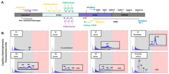 (A) Organization of the fragile X mental retardation 1 (FMR1) 5′ region, including the cytosine-guanine-guanine (CGG) expansion and primer binding site locations for AmplideX CGG sizing PCR, FastFraX High-Resolution Melt Analysis, and Methylation-Specific Quantitative Melt Analysis (MS-QMA), in relation to Fragile X-Related Epigenetic Element 2 (FREE2); the FMR1 CpG island and methylation sensitive restriction site NruI analysed using routine fragile X Southern blot testing; and two HpaII sites targeted by AmplideX methylation PCR. Note: The FMR1 translation start site is indicated in red overlapping with FastFraX 3′ melting curve analysis (MCA) primer. (B) AmplideX triplet-repeat primed long range PCR results for B1 and B2, for blood, buccal, saliva, and fibroblast DNA. Note: a reference sample co-run with the samples in question is included as the AmplideX sizing control in (B).